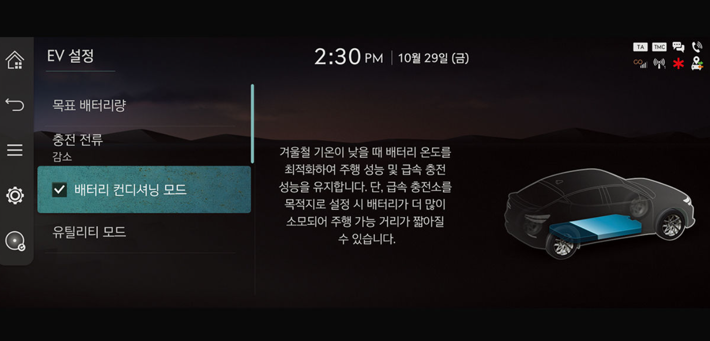 - 배터리 컨디셔닝 기술은 배터리 온도가 낮을 때 출력 성능 확보를 위한 예열뿐만 아니라 인포테인먼트 시스템과 연동해 고객이 급속 충전소를 검색할 경우, 충전소 도착 전 필요에 따라 배터리 온도를 최적화하여 저온 환경에서 충전 시간을 단축합니다.