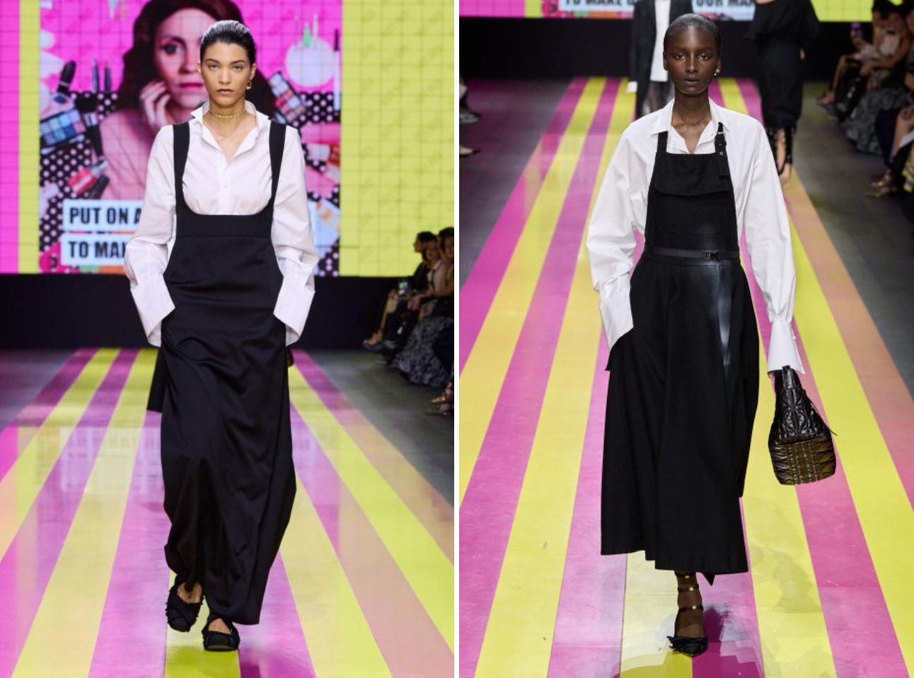 - 다음으로 앞치마룩의 유행인데요. 앞치마룩은 기존에도 유행을 했었지만 2024년에도 꾸준히 유행을 이어갈 예정입니다. 기존에도 그렇지만 다양한 앞치마의 색감과 질감으로 개성을 표현하기 아주 좋은 스타일의 라인업이였는데요. 특히 레이어링 하기가 정말 좋아 다양한 스타일 연출이 가능했던 스타일로 2024년에도 꾸준히 패션 트렌드로 자리 잡을 예정입니다.