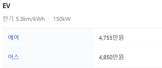 - 연비 : 복합 5.3km/kWh 도심 6, 고속 4.7