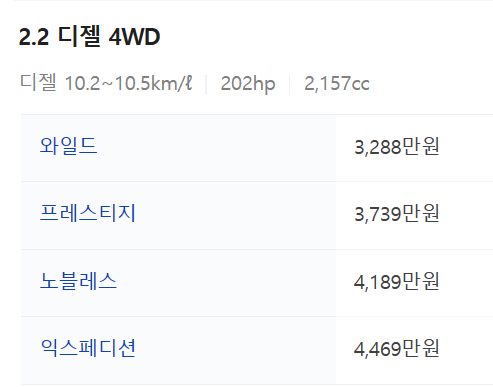 - 마지막으로 2024 렉스턴 스포츠 칸의 가격이 궁금하실텐데요. 등급별 트림은 2.2 디젤, 2.2 디젤 4WD, 2.2 디젤 쿨멘, 2.2 디젤 4WD 쿨멘으로 나누어 볼 수 있습니다. 각각의 등급별 트림에 자세한 가격은 아래와 같습니다.
