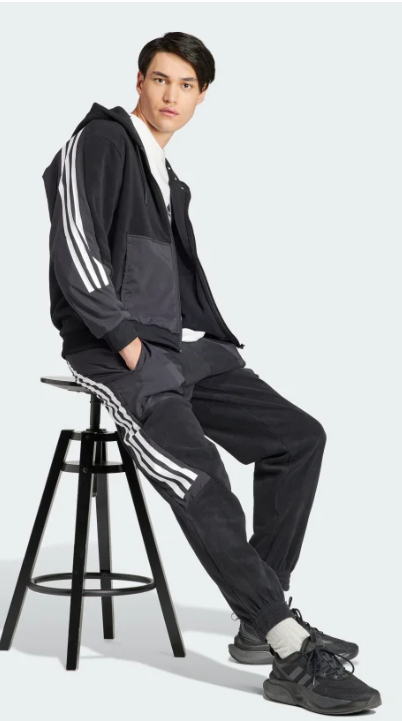- 두 번째로 소개해 드릴 제품은 아디다스의 퓨처 아이콘 3S입니다. 상의와 하의를 세트로 입어야 너무 이쁜 트레이닝복인데, 상의와 하의를 따로 판매하기 때문에 개별로 구매를 하셔서 매칭하셔야 합니다. 이 제품은 플리스 소재로 제작되었기 때문에 지금처럼 추운 겨울철에도 편하게 입을 수 있어 좋고요. 아디다스 특유의 삼선 스트라이프가 상의에서 하의로 이어져 내려오는 느낌을 줘서 세트로 입으면 너무 이쁜 트레이닝복입니다.