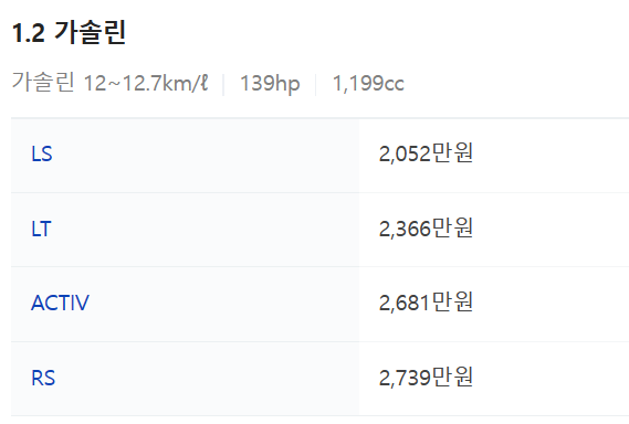 - 2024 쉐보레 트랙스 크로스오버는 가장 기본형인 LS 등급부터 가성비가 좋다는 LT 등급, ACTIV 등급 그리고 최상위 트림인 RS 등급으로 나눌 수 있습니다. 각각의 등급별 트림의 자세한 가격은 아래와 같습니다.