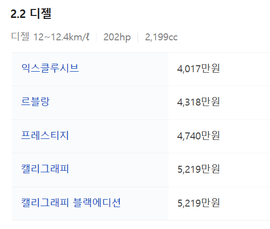 - 펠리세이드 등급별 트림은 2.2 디젤 / 2.2 디젤 AWD / 3.8 가솔린 / 3.8 가솔린 AWD로 나눌 수 있습니다. 각각의 등급별 트림 가격은 아래와 같습니다.
