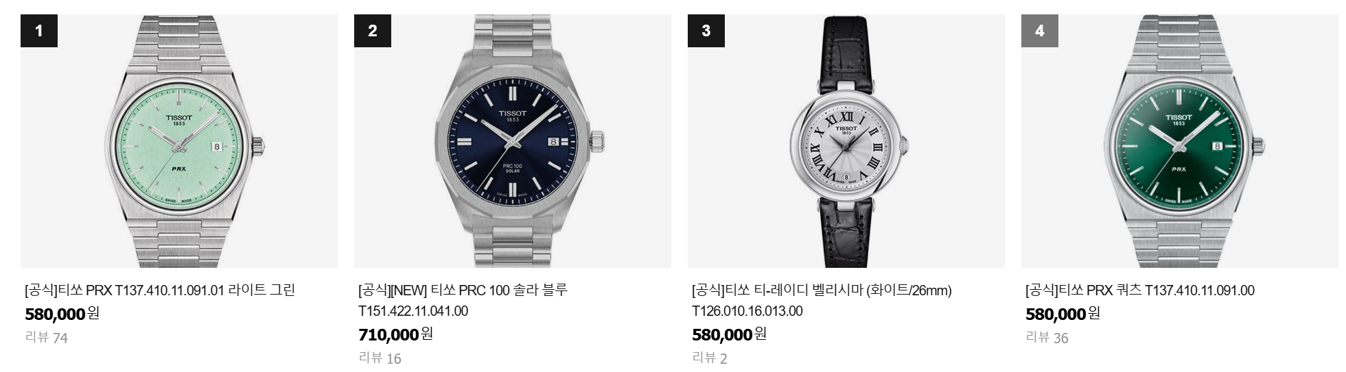 스위스 시계들의 대부분의 제품들은 몇 백만 원부터 많게는 몇 천만 원을 호가하는 경우가 많은데요. 티쏘는 사진에서와 같이 100만 원 미만대의 제품들이 많이 있어 가성비가 좋다고 평가받고 있고요. 실제로 사진 상에 순위가 현재 티쏘에서 가장 많이 판매되고 있는 제품들인데, 100만 원을 넘지 않는다는 것을 알 수 있습니다. 대표적인 모델로는 사진에 있는 PRX 시리즈와 Gentleman Powermatic 80 등이 있습니다.
