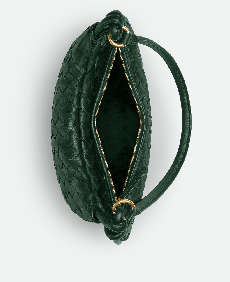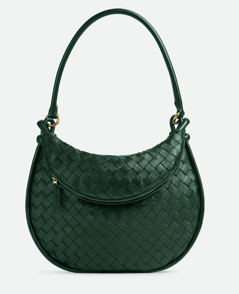 - 오늘 소개해 드릴 제품은 보테가베네타의 미디엄 제멜리인데요. 특유의 고급스러운 가죽 느낌과 아름다운 색상이 특징인 가방입니다. 보테가베네타의 시그니처라고 할 수 있는 인트레치아토 패턴이 돋보이는데요. 인트레치아토란 사진처럼 가죽을 위빙 하여(엮어서) 만드는 기술을 의미합니다. 이렇게 인트레치아토 위빙을 하면 가죽이 몇 배로 많이 들어가기 때문에 내구성도 훨씬 좋아지고 디자인 측면에서도 더욱 아름다운 가죽의 질감을 느낄 수 있는 특징이 있습니다.