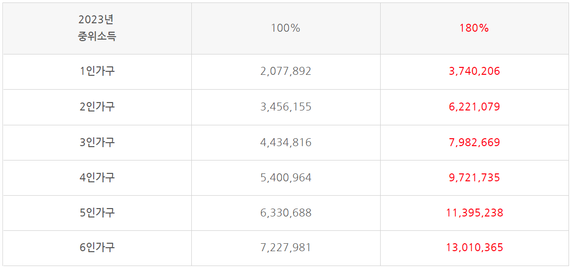 - 중위소득 180% 이하라고 하면 어느정도일지 감을 잡기가 어려워 아래 표와 같이 정리해드리겠습니다.